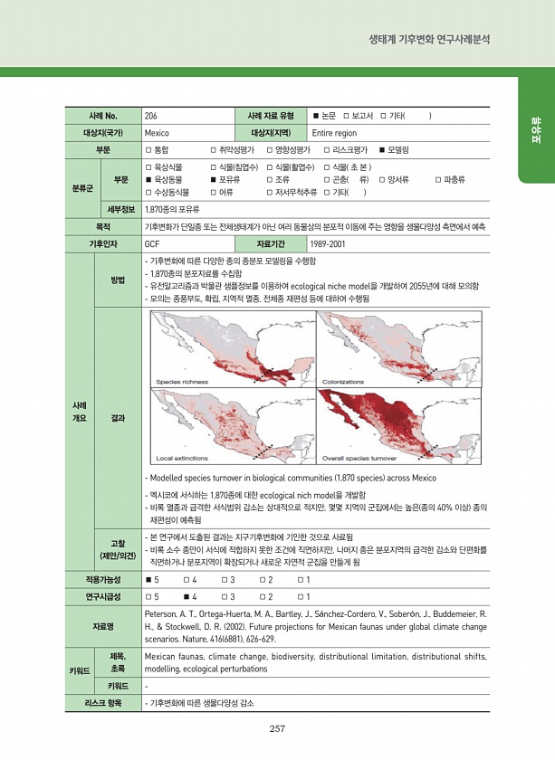 257 생태계 기후변화 연구사례분석 포유류 사례 No. 206 사례 자료 유형 ■ 논문 □ 보고서 □ 기타 대상지 국가 Mexico 대상지 지역 Entire region 부문 □ 통합 □ 취약성평가 □ 영향성평가 □ 리스크평가 ■ 모델링 분류군 부문 □ 육상식물 □ 식물 침엽수 □ 식물 활엽수 □ 식물 초 본 ■ 육상동물 ■ 포유류 □ 조류 □ 곤충 류 □ 양서류 □ 파충류 □ 수상동식물 □ 어류 □ 저서무척추류 □ 기타 세부정보 1,870종의 포유류 목적 기후변화가 단일종 또는 전체생태계가 아닌 여러 동물상의 분포적 이동에 주는 영향을 생물다양성 측면에서 예측 기후인자 GCF 자료기간 1989-2001 사례 개요 방법 기후변화에 따른 다양한 종의 종분포 모델링을 수행함 1,870종의 분포자료를 수집함 유전...