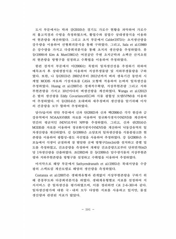 591 도시 부문에서는 박과 강 2010 은 경기도 가로수 현황을 파악하여 가로수 의 흉고직경과 수령을 측정하였으며, 활엽수와 침엽수 상대생장식을 이용하 여 현존량을 계산하였다. 그리고 초지 부문에서 Cable 1975 는 초지생산량을 강우량을 이용하여 선형회귀분석을 통해 구하였다. 그리고, Sala et al. 1988 은 강수량을 가지고 다중회귀분석을 통해 초지의 생산량을 추정하였다. 류 등 1999 과 Kim & Mun 1981 은 여천공단 주변 초지군락과 소백산 산지초원 의 현존량을 방형구를 설정하고 수확법을 이용하여 추정하였다. 한편 경작지 부문에서 이 2006 는 묵밭의 일차생산성을 추정하기 위하여 매목조사 후 상대생장식을 이용하여 지상부생물량 및 지하부생물량을 구하 였다. 또한, 나 등 2013...