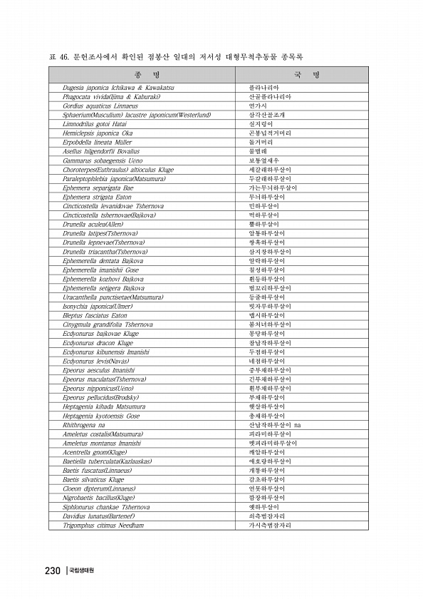 종 명 국 명 Dugesia japonica Ichikawa & Kawakatsu 플라나리아 Phagocata vivida Ijima & Kaburaki 산골플라나리아 Gordius aquaticus Linnaeus 연가시 Sphaerium Musculium lacustre japonicum Westerlund 삼각산골조개 Limnodrilus gotoi Hatai 실지렁이 Hemiclepsis japonica Oka 곤봉넙적거머리 Erpobdella lineata M?ller 돌거머리 Asellus hilgendorfii Bovalius 물벌레 Gammarus sobaegensis U?no 보통옆새우 Choroterpes Euthraulus altioculus Kluge 세갈래하루살이 Paraleptoph...