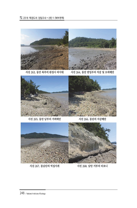 2018 특정도서 정밀조사 신안 1 북부권역 248 ? National Institute of Ecology 사진 263. 동안 북부의 완경사 파식대 사진 264. 동안 만입부의 자갈 및 모래해안 사진 265. 동안 남부의 거력해안 사진 266. 동단의 자갈해안 사진 267. 동남단의 역질사취 사진 268. 남안 서부의타포니
