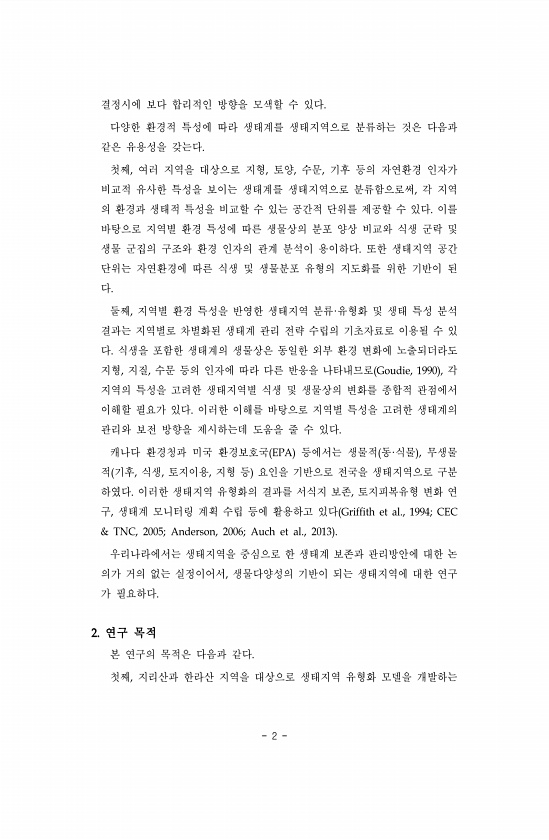 2 결정시에 보다 합리적인 방향을 모색할 수 있다. 다양한 환경적 특성에 따라 생태계를 생태지역으로 분류하는 것은 다음과 같은 유용성을 갖는다. 첫째, 여러 지역을 대상으로 지형, 토양, 수문, 기후 등의 자연환경 인자가 비교적 유사한 특성을 보이는 생태계를 생태지역으로 분류함으로써, 각 지역 의 환경과 생태적 특성을 비교할 수 있는 공간적 단위를 제공할 수 있다. 이를 바탕으로 지역별 환경 특성에 따른 생물상의 분포 양상 비교와 식생 군락 및 생물 군집의 구조와 환경 인자의 관계 분석이 용이하다. 또한 생태지역 공간 단위는 자연환경에 따른 식생 및 생물분포 유형의 지도화를 위한 기반이 된 다. 둘째, 지역별 환경 특성을 반영한 생태지역 분류·유형화 및 생태 특성 분석 결과는 지역별로 차별화된 생태계 관리 ...