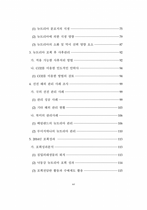 xvi 1 뉴트리아 분포지의 식생 ·································································75 2 뉴트리아에 의한 식생 영향 ···························································79 3 뉴트리아의 소화 및 먹이 선택 영향 요소 ·································87 3. 뉴트리아 포획 후 사후관리 ·································································92 가. 적용 가능한 사후처리 방법 ····························································92 나. CO2...