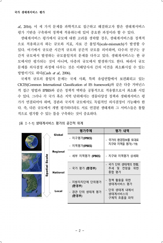 국가 생태계서비스 평가 2 al., 2016 이 세 가지 문제를 과학적으로 접근하고 해결하고자 함은 생태계서비스 평가 기반을 구축하여 정책에 적용하는데 있어 중요한 과정이라 할 수 있다. 생태계서비스 평가에서 규모에 대한 고려를 생략할 경우, 생태계서비스를 정책적 으로 적용하고자 하는 규모와 지표, 자료 간 불일치 scale-mismatch 가 발생할 수 있다. 여기에서 규모란 시간적 규모와 공간적 규모를 의미하며, 다수의 연구는 공 간적 규모에서 발생하는 규모불일치의 문제를 다루고 있다. 생태계서비스는 한 규 모에서만 평가되는 것이 아니며, 다층의 규모에서 발생하기도 한다. 따라서 규모 문제를 의사결정 과정에 다루는 것은 이해당사자 간의 이견을 최소화시킬 수 있는 방법이기도 하다 Cash et al., 2...