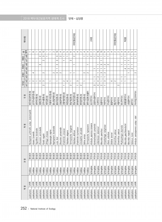 252 ? National Institute of Ecology 목 명 과 명 학 명 국 명 두타산 수병산 자병산 석병산 총 st1 st2 st3 st4 st5 st6 st7 st8 합계 특이사항 Lepidoptera 나비목 Pyralidae 명나방과 Nyctegretis achtinella subsp. katastropella 밝은세모알락명나방 1 1 Lepidoptera 나비목 Pyralidae 명나방과 Assara funerella 삼각무늬알락명나방 2 4 6 Lepidoptera 나비목 Pyralidae 명나방과 Tegulifera bicoloralis 쌍띠비단명나방 1 1 Lepidoptera 나비목 Pyralidae 명나방과 Oncocera semirubella 앞붉은명나방 3 3 2 8 Lepi...