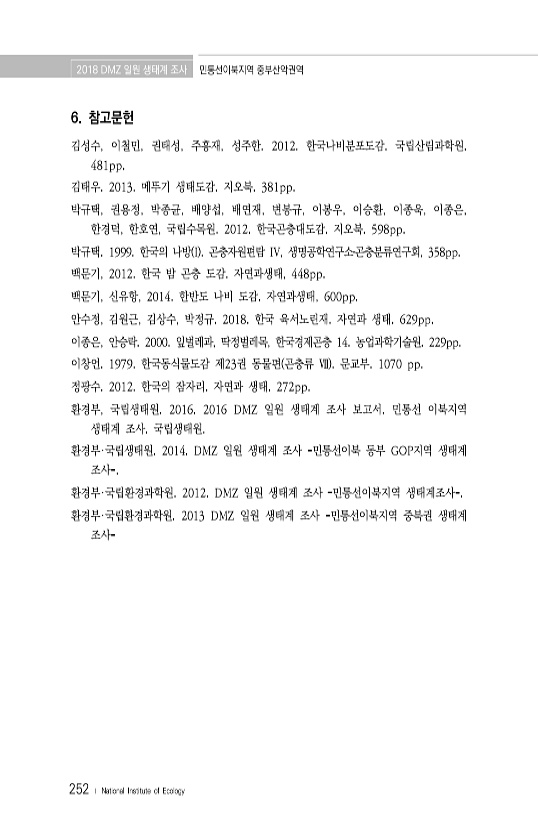 2018 DMZ 일원 생태계 조사 민통선이북지역 중부산악권역 252 ? National Institute of Ecology 6. 참고문헌 김성수, 이철민, 권태성, 주흥재, 성주한. 2012. 한국나비분포도감. 국립산림과학원. 481pp. 김태우. 2013. 메뚜기 생태도감. 지오북. 381pp. 박규택, 권용정, 박종균, 배양섭, 배연재, 변봉규, 이봉우, 이승환, 이종욱, 이종은, 한경덕, 한호연, 국립수목원. 2012. 한국곤충대도감. 지오북. 598pp. 박규택. 1999. 한국의 나방 I 곤충자원편람 IV, 생명공학연구소?곤충분류연구회, 358pp. 백문기, 2012. 한국 밤 곤충 도감. 자연과생태, 448pp. 백문기, 신유항, 2014. 한반도 나비 도감. 자연과생태, 600pp. 안수정, ...