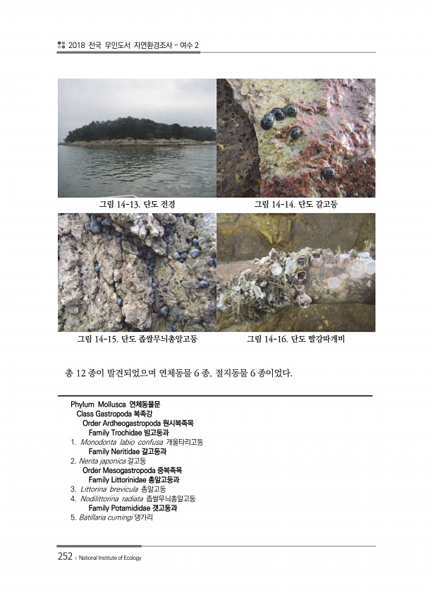 2018 전국 무인도서 자연환경조사 여수 2 252 ? National Institute of Ecology 그림 14-13. 단도 전경 그림 14-14. 단도 갈고둥 그림 14-15. 단도 좁쌀무늬총알고둥 그림 14-16. 단도 빨강따개비 총 12 종이 발견되었으며 연체동물 6 종, 절지동물 6 종이었다. Phylum Mollusca 연체동물문 Class Gastropoda 복족강 Order Ardheogastropoda 원시복족목 Family Trochidae 밤고둥과 1. Monodonta labio confusa 개울타리고둥 Family Neritidae 갈고둥과 2. Nerita japonica 갈고둥 Order Mesogastropoda 중복족목 Family Littorinidae 총알고둥과 3....