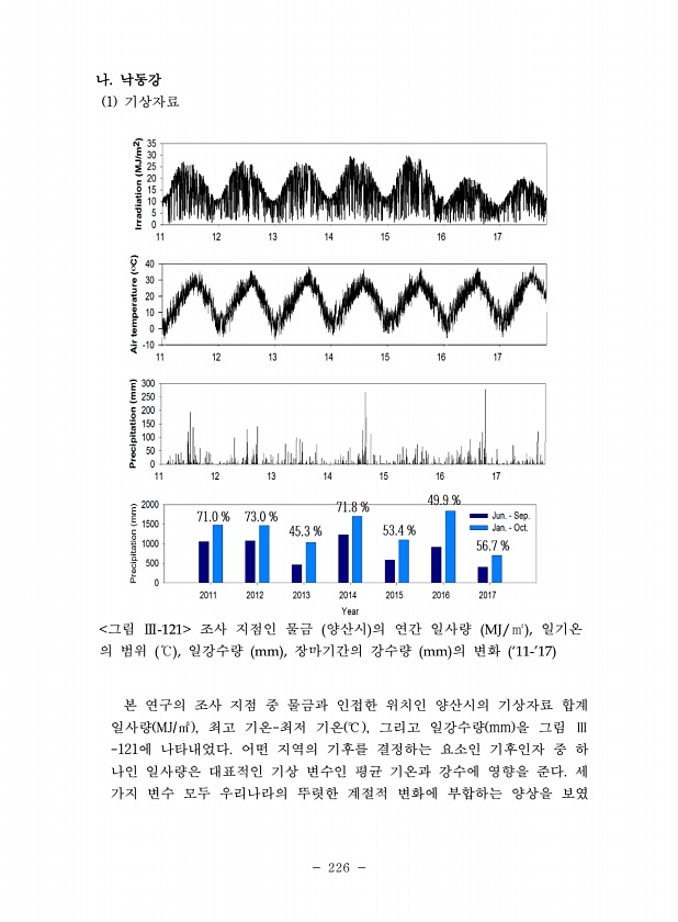 226 나. 낙동강 1 기상자료 그림 Ⅲ-121 조사 지점인 물금 양산시 의 연간 일사량 MJ/㎡ , 일기온 의 범위 ℃ , 일강수량 mm , 장마기간의 강수량 mm 의 변화 ‘11-’17 본 연구의 조사 지점 중 물금과 인접한 위치인 양산시의 기상자료 합계 일사량 MJ/㎡ , 최고 기온-최저 기온 ℃ , 그리고 일강수량 mm 을 그림 Ⅲ -121에 나타내었다. 어떤 지역의 기후를 결정하는 요소인 기후인자 중 하 나인 일사량은 대표적인 기상 변수인 평균 기온과 강수에 영향을 준다. 세 가지 변수 모두 우리나라의 뚜렷한 계절적 변화에 부합하는 양상을보였