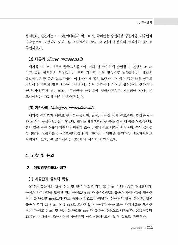 Ⅱ. 조사결과 www.nie.re.kr ? 253 섭식한다. 산란기는 4 5월이다 김과 박, 2002 국외반출 승인대상 생물자원, 기후변화 민감종으로 지정되어 있다. 본 조사에서는 NS2, NS3에서 우점하여 서식하는 것으로 확인되었다. 2 미유기 Silurus microdorsalis 메기목 메기과 어류로 한국고유종이며, 거의 전 담수역에 출현한다. 전장은 25 ㎝ 이고 몸의 앞부분은 원통형이나 뒤로 갈수로 수직 방향으로 납작해진다. 채색은 흑갈색으로 등 쪽은 짙고 주둥이 아랫면과 배 쪽은 노란색이다. 물이 많은 하천 상류의 자갈이나 바위가 많은 하천에 서식하며, 수서 곤충이나 치어를 섭식한다. 산란기는 5월경이다 김과 박, 2002 국외반출 승인대상 생물자원으로 지정되어 있다. 본 조사에서는 NS2에 서...