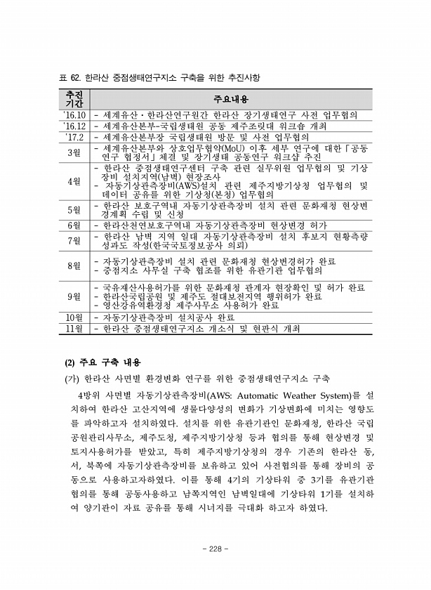 추진 기간 주요내용 ?16.10 세계유산·한라산연구원간 한라산 장기생태연구 사전 업무협의 ?16.12 세계유산본부-국립생태원 공동 제주조릿대 워크숍 개최 ?17.2 세계유산본부장 국립생태원 방문 및 사전 업무협의 3월 세계유산본부와 상호업무협약 MoU 이후 세부 연구에 대한「공동 연구 협정서」체결 및 장기생태 공동연구 워크샵 추진 4월 한라산 중점생태연구센터 구축 관련 실무위원 업무협의 및 기상 장비 설치지역 남벽 현장조사 자동기상관측장비 AWS 설치 관련 제주지방기상청 업무협의 및 데이터 공유를 위한 기상청 본청 업무협의 5월 한라산 보호구역내 자동기상관측장비 설치 관련 문화재청 현상변 경계획 수립 및 신청 6월 한라산천연보호구역내 자동기상관측장비 현상변경 허가 7월 한라산 남벽 지역 일대 자동기상관측장비...