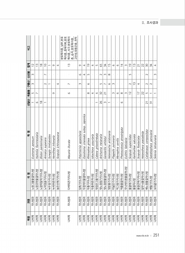 251 목명 과명 국 명 학 명 선달산 옥돌봉 구룡산 신선봉 합계 비고 나비목 자나방과 노랑그물물결자나방 Eustroma aerosum 1 5 3 3 12 나비목 자나방과 노랑꼬마물결자나방 Hydrelia flammeolaria 6 7 13 나비목 자나방과 노랑띠알락가지나방 Biston panterinaria 18 18 나비목 자나방과 노박덩굴가지나방 Amraica superans 1 2 7 10 나비목 자나방과 녹두빛가지나방 Synegia limitatoides 1 1 나비목 자나방과 녹색푸른자나방 Hemithea tritonaria 9 9 나비목 자나방과 높은산애기자나방 Scopula ichinosawana 4 4 나비목 자나...