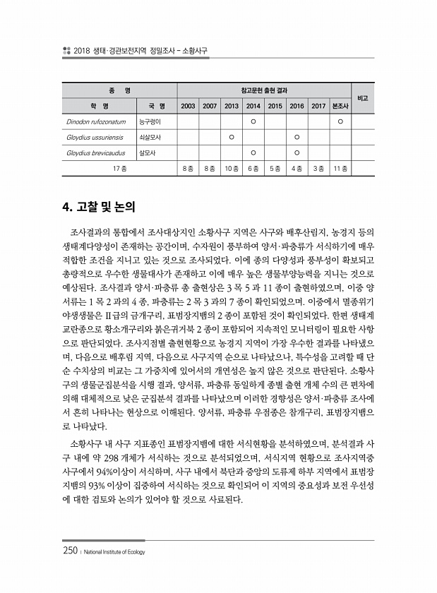 2018 생태·경관보전지역 정밀조사 소황사구 250 ? National Institute of Ecology 4. 조사결과의 통합에서 조사대상지인 소황사구 지역은 사구와 배후산림지, 농경지 등의 생태계다양성이 존재하는 공간이며, 수자원이 풍부하여 양서·파충류가 서식하기에 매우 적합한 조건을 지니고 있는 것으로 조사되었다. 이에 종의 다양성과 풍부성이 확보되고 총량적으로 우수한 생물대사가 존재하고 이에 매우 높은 생물부양능력을 지니는 것으로 예상된다. 조사결과 양서·파충류 총 출현상은 3 목 5 과 11 종이 출현하였으며, 이중 양 서류는 1 목 2 과의 4 종, 파충류는 2 목 3 과의 7 종이 확인되었으며. 이중에서 멸종위기 야생생물은 Ⅱ급의 금개구리, 표범장지뱀의 2 종이 포함된 것이 확인되었다. 한편 ...