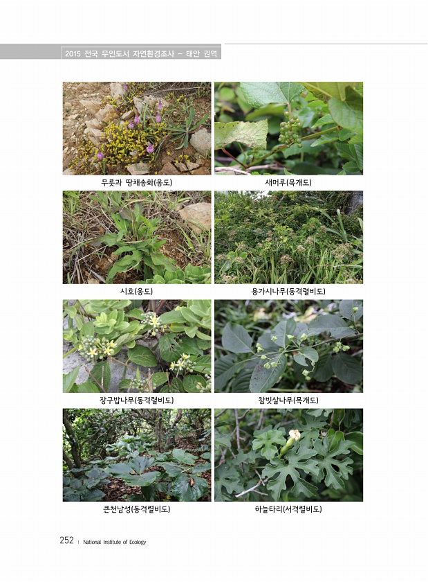 2015 전국 무인도서 자연환경조사 태안 권역 252 ? National Institute of Ecology 무릇과 땅채송화 옹도 새머루 목개도 시호 옹도 용가시나무 동격렬비도 장구밥나무 동격렬비도 참빗살나무 목개도 큰천남성 동격렬비도 하늘타리 서격렬비도