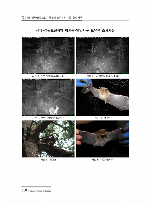 2016 생태·경관보전지역 정밀조사 하시동 · 안인사구 250 ? National Institute of Ecology 생태·경관보전지역 하시동·안인사구 포유류 조사사진 사진 1. 무인센서카메라 너구리 사진 2. 무인센서카메라 오소리 사진 3. 무인센서카메라 고라니 사진 4. 관박쥐 사진 5. 청설모 사진 6.쇠큰수염박쥐