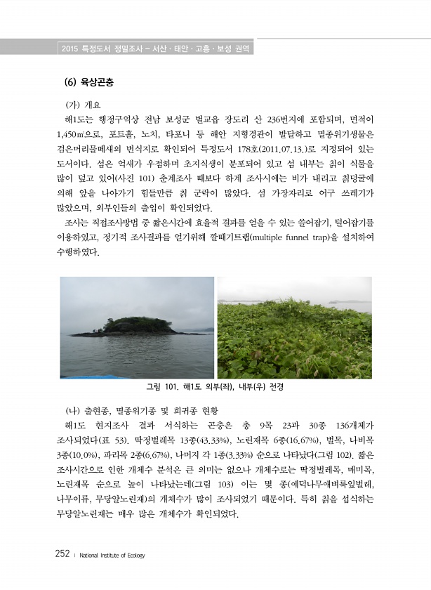 2015 특정도서 정밀조사 서산·태안·고흥·보성 권역 252 ? National Institute of Ecology 6 육상곤충 가 개요 해1도는 행정구역상 전남 보성군 벌교읍 장도리 산 236번지에 포함되며, 면적이 1,450㎡으로, 포트홀, 노치, 타포니 등 해안 지형경관이 발달하고 멸종위기생물은 검은머리물떼새의 번식지로 확인되어 특정도서 178호 2011.07.13. 로 지정되어 있는 도서이다. 섬은 억새가 우점하며 초지식생이 분포되어 있고 섬 내부는 칡이 식물을 많이 덮고 있어 사진 101 춘계조사 때보다 하계 조사시에는 비가 내리고 칡덩굴에 의해 앞을 나아가기 힘들만큼 칡 군락이 많았다. 섬 가장자리로 어구 쓰레기가 많았으며, 외부인들의 출입이 확인되었다. 조사는 직접조사방법 중 짧은시간에 효율적...