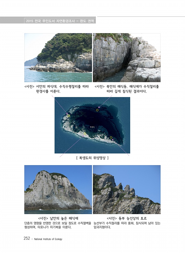 2015 전국 무인도서 자연환경조사 완도 권역 252 ? National Institute of Ecology [ 복생도의 위성영상 ] 사진 서안의 파식대. 수직수평절리를 따라 완경사를 이룬다. 사진 북안의 해식동. 해식애가 수직절리를 따라 깊게 침식된 결과이다. 사진 남안의 높은 해식애 단층의 영향을 반영한 것으로 보일 정도로 수직절벽을 형성하며, 타포니가 미기복을 이룬다. 사진 동부 능선상의 토르 능선부가 수직절리를 따라 풍화, 침식되며 남아 있는암괴지형이다.