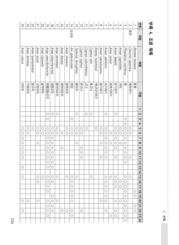 Ⅴ. 부록 236 번호 과명 학명 국명 1 2 3 4 5 6 7 8 9 10 11 12 13 14 15 16 17 18 19 20 21 22 23 24 1 꿩과 Bonasa bonasia 들꿩 ○ ○ ○ ○ 2 Coturnix japonica 메추라기 ○ ○ ○ ○ 3 Phasianus colchicus 꿩 ○ ○ ○ ○ ○ ○ ○ ○ ○ ○ ○ ○ ○ ○ ○ ○ ○ ○ ○ ○ 4 오리과 Anser cygnoides 개리 ○ ○ ○ ○ ○ ○ 5 Anser fabalis 큰기러기 ○ ○ ○ ○ ○ ○ ○ ○ ○ ○ ○ ○ ○ 6 Anse ranser 회색기러기 ○ ○ ○ ○ 7 Anser albifrons 쇠기러기 ○ ○ ○ ○ ○ ○ ○ ○ ○ ○ ○ ○ ○ ○ ○ 8 Anser caerulescens 흰...