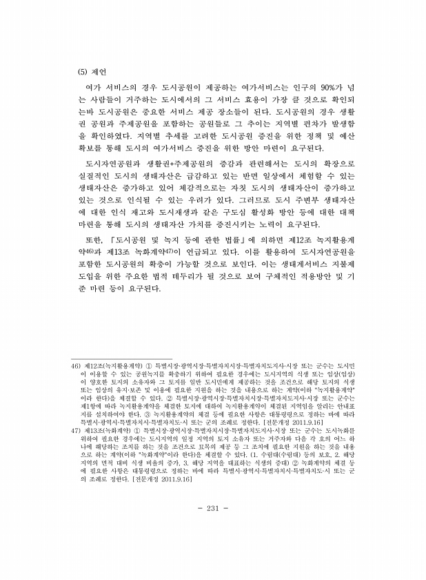 231 5 제언 여가 서비스의 경우 도시공원이 제공하는 여가서비스는 인구의 90%가 넘 는 사람들이 거주하는 도시에서의 그 서비스 효용이 가장 클 것으로 확인되 는바 도시공원은 중요한 서비스 제공 장소들이 된다. 도시공원의 경우 생활 권 공원과 주제공원을 포함하는 공원들로 그 추이는 지역별 편차가 발생함 을 확인하였다. 지역별 추세를 고려한 도시공원 증진을 위한 정책 및 예산 확보를 통해 도시의 여가서비스 증진을 위한 방안 마련이 요구된다. 도시자연공원과 생활권+주제공원의 증감과 관련해서는 도시의 확장으로 실질적인 도시의 생태자산은 급감하고 있는 반면 일상에서 체험할 수 있는 생태자산은 증가하고 있어 체감적으로는 자칫 도시의 생태자산이 증가하고 있는 것으로 인식될 수 있는 우려가 있다. 그러므로 도시 주변부...