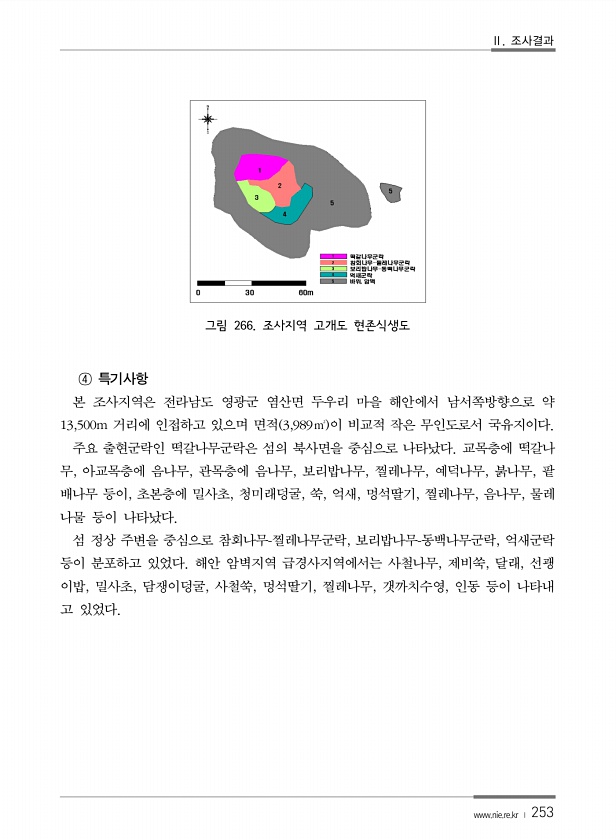 Ⅱ. 조사결과 www.nie.re.kr ? 253 그림 266. 조사지역 고개도 현존식생도 ④ 특기사항 본 조사지역은 전라남도 영광군 염산면 두우리 마을 해안에서 남서쪽방향으로 약 13,500m 거리에 인접하고 있으며 면적 3,989㎡ 이 비교적 작은 무인도로서 국유지이다. 주요 출현군락인 떡갈나무군락은 섬의 북사면을 중심으로 나타났다. 교목층에 떡갈나 무, 아교목층에 음나무, 관목층에 음나무, 보리밥나무, 찔레나무, 예덕나무, 붉나무, 팥 배나무 등이, 초본층에 밀사초, 청미래덩굴, 쑥, 억새, 멍석딸기, 찔레나무, 음나무, 물레 나물 등이 나타났다. 섬 정상 주변을 중심으로 참회나무-찔레나무군락, 보리밥나무-동백나무군락, 억새군락 등이 분포하고 있었다. 해안 암벽지역 급경사지역에서는 사철나무, 제비쑥, ...