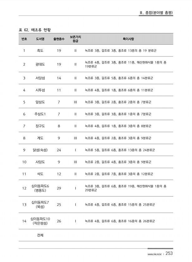 Ⅲ. 종합 분야별 총평 www.nie.re.kr ? 253 표 62. 해조류 현황 번호 도서명 출현종수 보존가치 등급 특이사항 1 흑도 19 II 녹조류 3종, 갈조류 3종, 홍조류 13종의 총 19 분류군 2 광대도 19 II 녹조류 4종, 갈조류 3종, 홍조류 11종, 해산현화식물 1종의 총 19분류군 3 서당섬 14 II 녹조류 3종, 갈조류 5종, 홍조류 6종의 총 14분류군 4 시투섬 11 II 녹조류 4종, 갈조류 1종, 홍조류 6종의 총 11분류군 5 앞삼도 7 III 녹조류 3종, 갈조류 2종, 홍조류 2종의 총 7분류군 6 주삼도1 7 II 녹조류 3종, 갈조류 3종, 홍조류 1종의 총 7분류군 7 장구도 8 II 녹조류 4종, 갈조류 1종, 홍조류 3종의 총 8분류군 8 계도 9 III 녹...