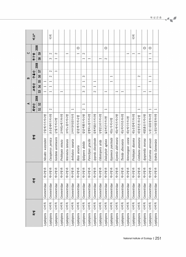 육 상 곤 충 National Institute of EcologyⅠ251 목명 과명 종명 A B C 희양산 비고* 2008 조령산 주흘산 2008 투구봉 2008 S1 S2 S3 S4 S5 S6 S7 S8 S9 Lepidoptera 나비목 Geometridae 자나방과 Ninodes watanabei 구름애기가지나방 1 1 1 Lepidoptera 나비목 Geometridae 자나방과 Ourapteryx persica 굵은줄제비가지나방 2 1 1 1 2 2 3 2 국외 Lepidoptera 나비목 Geometridae 자나방과 Scardamia aurantiacaria 금빛가지나방 1 1 2 Lepidoptera 나비목 Geometridae 자나방과 Problepsis minuta 꼬마네눈애기자나방 1 L...