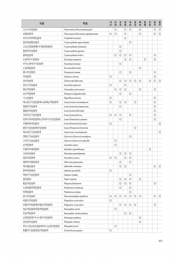 261 사시나무잎벌레 Chrysomela Chrysomela populi ○ ○ ○ ○ ○ ○ 버들잎벌레 Chrysomela Microdera vigintipunctata ○ ○ ○ ○ ○ ○ 유리꼬마벼룩잎벌레 Crepidodera picipes ○ 닮은북방통잎벌레 Cryptocephalus approximatus ○ 소요산잎벌레 황다리찔레잎벌레 Cryptocephalus fortunatus ○ 팔점박이잎벌레 Cryptocephalus japanus ○ 콜체잎벌레 Cryptocephalus koltzei ○ ○ ○ ○ ○ 노랑테가시잎벌레 Dactylispa angulosa ○ ○ ○ ○ 우리노랑테가시잎벌레 Dactylispa koreana ○ 노랑배잎벌레 Exosoma faviventre ○ 뽕나무잎벌레 F...