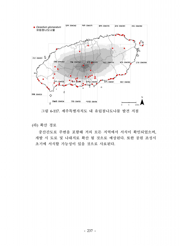 237 그림 6-117. 제주특별자치도 내 유럽점나도나물 발견 지점 라 확산 경로 중산간도로 주변을 포함해 거의 모든 지역에서 서식이 확인되었으며, 개발 시 도로 및 나대지로 확산 될 것으로 예상된다. 또한 공원 조성시 초기에 서식할 가능성이 있을 것으로사료된다.