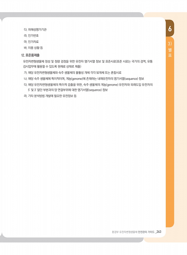 환경부 유전자변형생물체 안전관리 가이드 _263 6 별 표 3 다. 위해성평가기관 라. 인가번호 마. 인가자료 바. 이용 상황 등 12. 표준품제출 유전자변형생물체 정성 및 정량 검정을 위한 유전자 염기서열 정보 및 표준시료 표준 시료는 국가의 검역, 유통 감시업무에 활용할 수 있도록 원재료 상태로 제출 가. 해당 유전자변형생물체와 숙주 생물체의 불활성 개체 각각 50개체 또는 혼합시료 나. 해당 숙주 생물체에 특이적이며, 게놈 genome 에 존재하는 내재유전자의 염기서열 sequence 정보 다. 해당 유전자변형생물체의 특이적 검출을 위한, 숙주 생물체의 게놈 genome 유전자와 외래도입 유전자의 5′ 및 3′ 말단 부분과의 양 연결부위에 대한 염기서열 sequence 정보 라. 기타 분석방법 개발에 ...