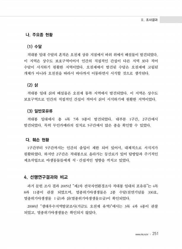 Ⅱ. 조사결과 www.nie.re.kr ? 251 나. 주요종 현황 1 수달 적대봉 일대 수달의 흔적은 오천제 상류 지점에서 바위 위에서 배설물이 발견되었다. 이 지역은 상수도 보호구역이어서 인간의 직접적인 간섭이 다른 지역 보다 적어 수달이 서식하기 원활한 지역이었다. 오천제에서 발견된 수달은 오천제에 고립된 개체가 아니라 오천천을 따라서 바다까지 이동하면서 서식할 것으로 생각된다. 2 삵 적대봉 일대 삵의 배설물은 오천제 동쪽 지역에서 발견되었다. 이 지역은 상수도 보호구역으로 인간의 직접적인 간섭이 적어서 삵이 서식하기에 원활한 지역이었다. 3 일반포유류 적대봉 일대에서 총 4목 7과 9종이 발견되었다. 대부분 1구간, 2구간에서 발견되었다. 특히 무인카메라의 설치로 5구간에서 많은 종을 확인할 수 있...