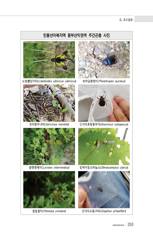 Ⅱ. 조사결과 www.nie.re.kr ? 253 민통선이북지역 중부산악권역 주간곤충 사진 노랑뿔잠자리 Libelloides sibiricus sibiricus 보라금풍뎅이 Phelotrupes auratus 꼬리명주나비 Sericinus montela 긴다리호랑꽃무지 Gnorimus subopacus 참깽깽매미 Lyristes intermedius 점박이염소하늘소 Olenecamptus clarus 참밑들이 Panorpa coreana 긴다리소똥구리 Sisyphus schaefferi