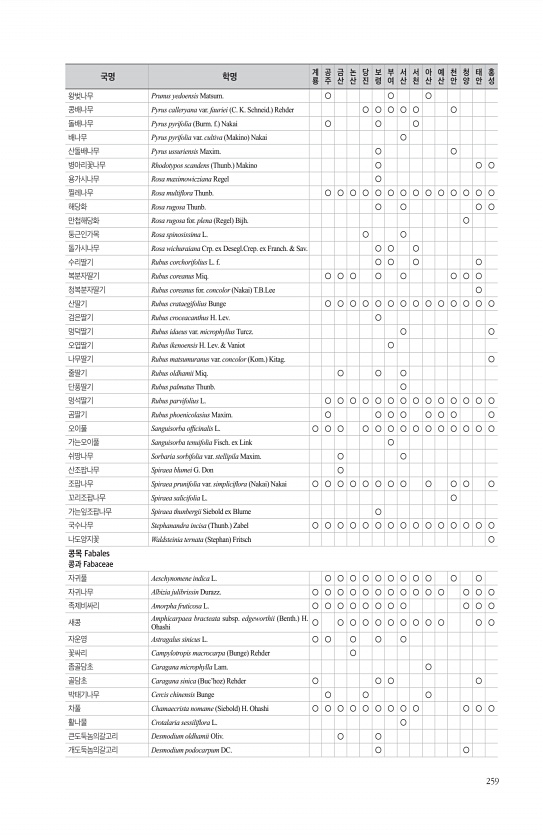 259 왕벚나무 Prunus yedoensis Matsum. ○ ○ ○ 콩배나무 Pyrus calleryana var. fauriei C. K. Schneid. Rehder ○ ○ ○ ○ ○ ○ 돌배나무 Pyrus pyrifolia Burm. f. Nakai ○ ○ ○ 배나무 Pyrus pyrifolia var. cultiva Makino Nakai ○ 산돌배나무 Pyrus ussuriensis Maxim. ○ ○ 병아리꽃나무 Rhodotypos scandens Thunb. Makino ○ ○ ○ 용가시나무 Rosa maximowicziana Regel ○ 찔레나무 Rosa multifora Thunb. ○ ○ ○ ○ ○ ○ ○ ○ ○ ○ ○ ○ ○ ○ 해당화 Rosa rugosa Thunb. ○ ○ ○ ○...