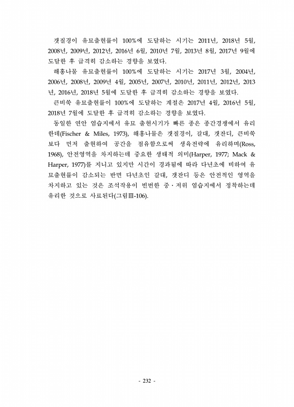 232 갯질경이 유묘출현률이 100%에 도달하는 시기는 2011년, 2018년 5월, 2008년, 2009년, 2012년, 2016년 6월, 2010년 7월, 2013년 8월, 2017년 9월에 도달한 후 급격히 감소하는 경향을 보였다. 해홍나물 유묘출현률이 100%에 도달하는 시기는 2017년 3월, 2004년, 2006년, 2008년, 2009년 4월, 2005년, 2007년, 2010년, 2011년, 2012년, 2013 년, 2016년, 2018년 5월에 도달한 후 급격히 감소하는 경향을 보였다. 큰비쑥 유묘출현률이 100%에 도달하는 계절은 2017년 4월, 2016년 5월, 2018년 7월에 도달한 후 급격히 감소하는 경향을 보였다. 동일한 연안 염습지에서 유묘 출현시기가 빠른 종은 종간경쟁에서 ...