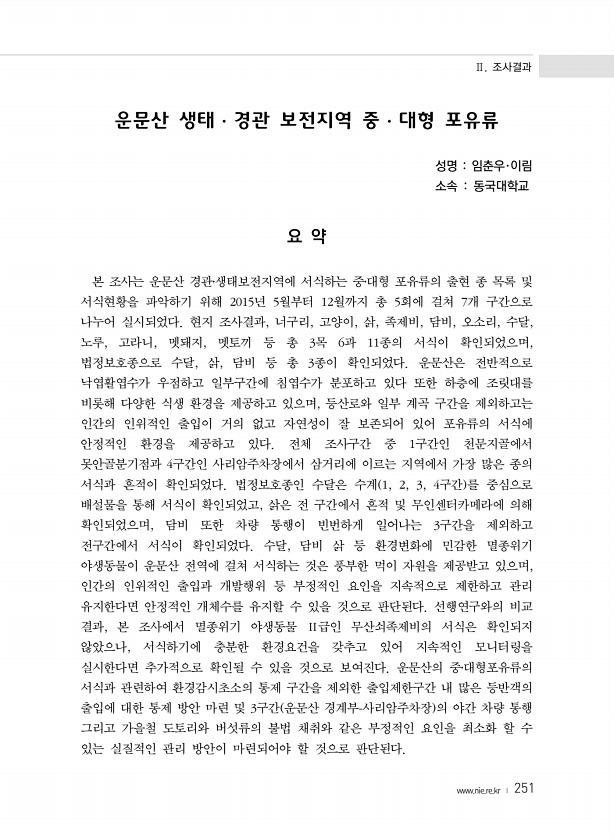 Ⅱ. 조사결과 www.nie.re.kr ? 251 운문산 생태·경관 보전지역 중·대형 포유류 성명 임춘우·이림 소속 동국대학교 요 약 본 조사는 운문산 경관?생태보전지역에 서식하는 중?대형 포유류의 출현 종 목록 및 서식현황을 파악하기 위해 2015년 5월부터 12월까지 총 5회에 걸쳐 7개 구간으로 나누어 실시되었다. 현지 조사결과, 너구리, 고양이, 삵, 족제비, 담비, 오소리, 수달, 노루, 고라니, 멧돼지, 멧토끼 등 총 3목 6과 11종의 서식이 확인되었으며, 법정보호종으로 수달, 삵, 담비 등 총 3종이 확인되었다. 운문산은 전반적으로 낙엽활엽수가 우점하고 일부구간에 침엽수가 분포하고 있다 또한 하층에 조릿대를 비롯해 다양한 식생 환경을 제공하고 있으며, 등산로와 일부 계곡 구간을 제외하고는 인간...