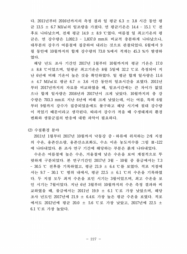 227 다. 2011년부터 2016년까지의 측정 결과 일 평균 6.3 ± 3.8 시간 동안 평 균 13.5 ± 6.7 MJ/㎡의 일조량을 가졌다. 연 평균기온은 14.4 ? 15.1 ℃ 전 후로 나타났으며, 전체 평균 14.9 ± 8.9 ℃였다. 여름철 일 최고기온의 평 균은. 연 강수량은 1,092.3 ? 1,837.0 mm로 비교적 충분하게 나타났으나, 대부분의 강우가 여름철에 집중하여 내리는 것으로 관찰되었다. 6월에서 9 월 동안에 10월까지의 합계 강수량의 73.0 %에서 적게는 45.3 %가 발생하 였다. 해당 년도 조사 기간인 2017년 1월부터 10월까지의 평균 기온은 17.0 ± 8.8 ℃이었으며, 일평균 최고기온은 8월 5일에 32.2 ℃로 측정되어 지 난 6년에 비해 기온이 높은 것을 확...