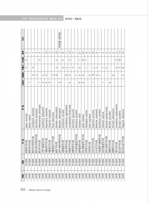 252 목명 과명 국 명 학 명 선달산 옥돌봉 구룡산 신선봉 합계 비고 나비목 자나방과 분홍애기자나방 Idaea muricata 3 3 6 나비목 자나방과 불회색가지나방 Biston regalis 1 1 나비목 자나방과 붉은무늬푸른자나방 Comibaena delicatior 4 3 7 나비목 자나방과 붉은선두리푸른자나방 Hemithea aestivaria 3 3 나비목 자나방과 뽕나무가지나방 Phthonandria atrilineata 1 3 4 나비목 자나방과 산애기물결자나방 Eupithecia kobayashii 3 2 5 나비목 자나방과 세줄날개가지나방 Hypomecis roboraria 4 6 10 나비목 자나방과 세줄...