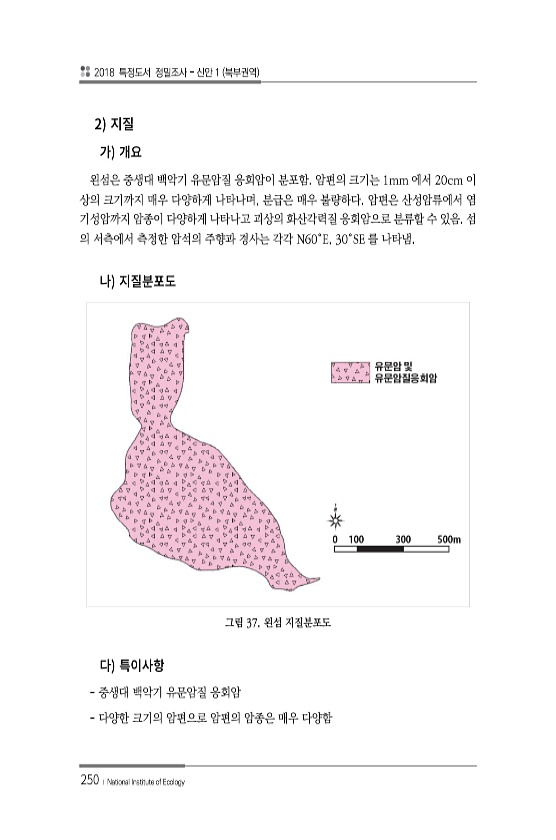 2018 특정도서 정밀조사 신안 1 북부권역 250 ? National Institute of Ecology 2 왼섬은 중생대 백악기 유문암질 응회암이 분포함. 암편의 크기는 1mm 에서 20cm 이 상의 크기까지 매우 다양하게 나타나며, 분급은 매우 불량하다. 암편은 산성암류에서 염 기성암까지 암종이 다양하게 나타나고 괴상의 화산각력질 응회암으로 분류할 수 있음. 섬 의 서측에서 측정한 암석의 주향과 경사는 각각 N60°E, 30°SE 를 나타냄. 그림 37. 왼섬 지질분포도 중생대 백악기 유문암질 응회암 다양한 크기의 암편으로 암편의 암종은 매우다양함