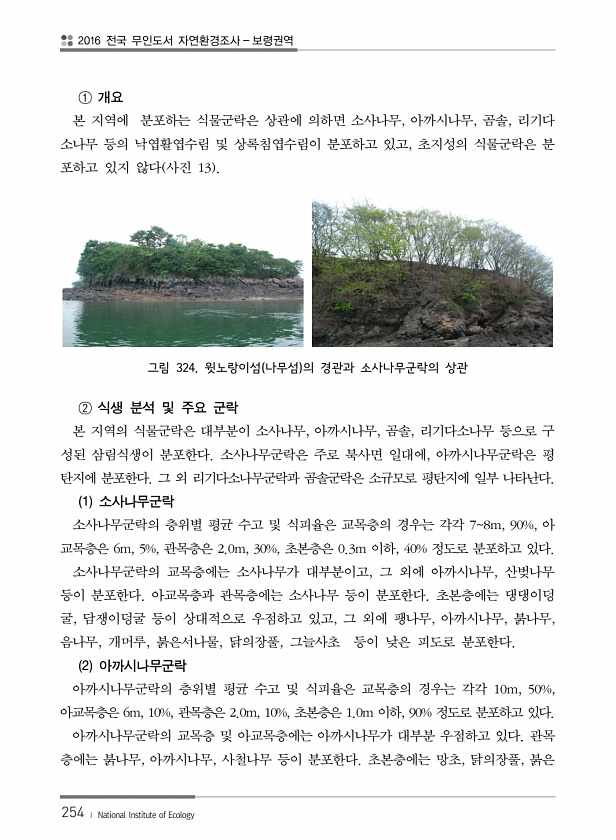 2016 전국 무인도서 자연환경조사 보령권역 254 ? National Institute of Ecology ① 개요 본 지역에 분포하는 식물군락은 상관에 의하면 소사나무, 아까시나무, 곰솔, 리기다 소나무 등의 낙엽활엽수림 및 상록침엽수림이 분포하고 있고, 초지성의 식물군락은 분 포하고 있지 않다 사진 13 그림 324. 윗노랑이섬 나무섬 의 경관과 소사나무군락의 상관 ② 식생 분석 및 주요 군락 본 지역의 식물군락은 대부분이 소사나무, 아까시나무, 곰솔, 리기다소나무 등으로 구 성된 삼림식생이 분포한다. 소사나무군락은 주로 북사면 일대에, 아까시나무군락은 평 탄지에 분포한다. 그 외 리기다소나무군락과 곰솔군락은 소규모로 평탄지에 일부 나타난다. 1 소사나무군락 소사나무군락의 층위별 평균 수고 및 식피율은...