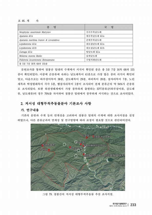종 명 국 명 Neophylax ussuriensis Martynov 가시우묵날도래 Apatania KUa 애우묵날도래 KUa Apatania maritima Ivanov & Levanidova 큰애우묵날도래 Lepidostoma KUa 네모집날도래 KUa Lepidostoma KUb 네모집날도래 KUb Gumaga KUa 털날도래 KUa Molanna moesta Banks 날개날도래 Psilotreta locumtenens Botosaneanu 수염치레날도래 총 5문 7강 16목 68과 155종 표 46. 계 속 문헌조사를 통하여 점봉산 일대의 수계에서 서식이 확인된 종은 총 5문 7강 16목 68과 155 종이 확인되었다. 이중에 곤충류에 속하는 날도래목이 41종으로 가장 많은 종의 서식이 확인되 었고...