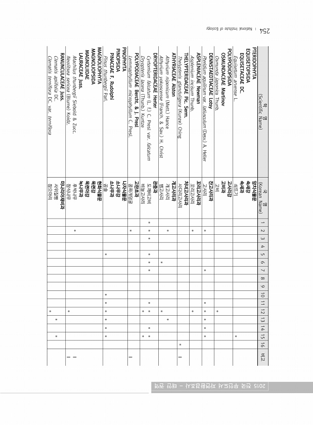254 학 명 Scientific Name 국 명 Korean Name 1 2 3 4 5 6 7 8 9 10 11 12 13 14 15 16 비고 PTERIDOPHYTA 양치식물문 EQUISETOPSIDA 속새강 EQUISETACEAE DC. 속새과 Equisetum arvense L. 쇠뜨기 * POLYPODIOPSIDA 고사리강 OSMUNDACEAE Martinov 고비과 Osmunda japonica Thunb. 고비 * DENNSTAEDTIACEAE Lotsy 잔고사리과 Pteridium aquilinum var. latiusculum Desv. A. Heller 고사리 * * * * * * * ASPLENIACEAE Newman 꼬리고사리과 Asplenium incisum Thunb. 꼬리고사리 *...
