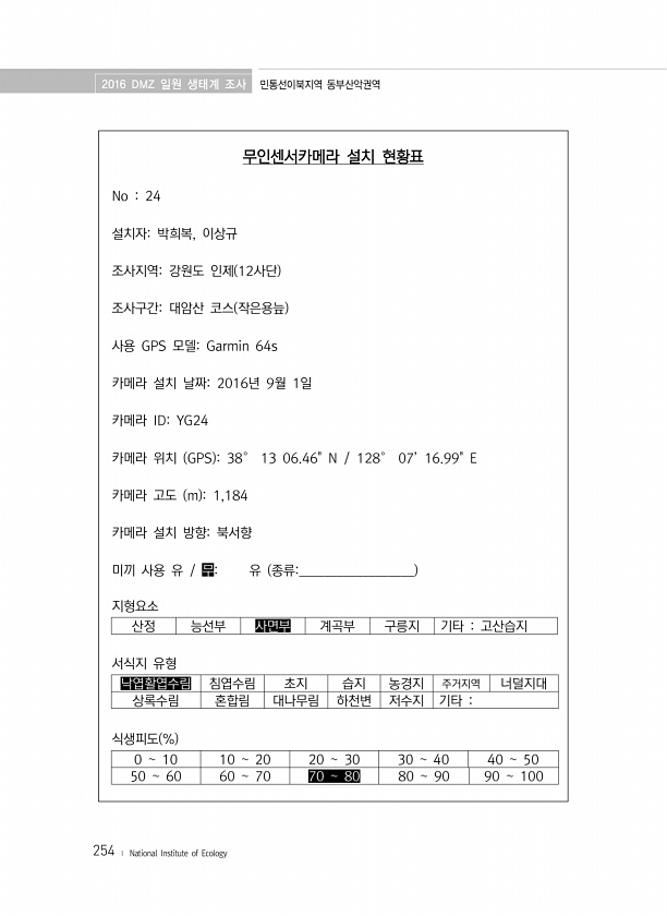 2016 DMZ 일원 생태계 조사 민통선이북지역 동부산악권역 254 ? National Institute of Ecology 무인센서카메라 설치 현황표 No 24 설치자박희복, 이상규 조사지역강원도 인제 12사단 조사구간대암산 코스 작은용늪 사용 GPS 모델Garmin 64s 카메라 설치 날짜2016년 9월 1일 카메라 IDYG24 카메라 위치 GPS 38° 13 06.46N 128° 07’ 16.99E 카메라 고도 m 1,184 카메라 설치 방향북서향 미끼 사용 유 무유 종류__________________ 지형요소 산정 능선부 사면부 계곡부 구릉지 기타 고산습지 서식지 유형 낙엽활엽수림 침엽수림 초지 습지 농경지 주거지역 너덜지대 상록수림 혼합림 대나무림 하천변 저수지 기타 식생피도 % 0 10 10 2...