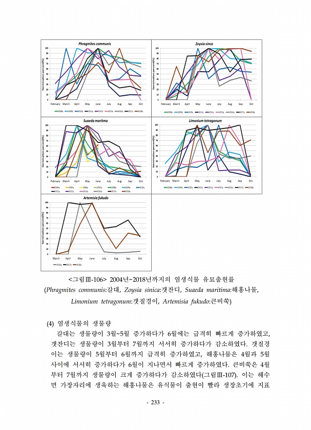 233 그림Ⅲ-106 2004년2018년까지의 염생식물 유묘출현률 Phragmites communis갈대, Zoysia sinica갯잔디, Suaeda maritima해홍나물, Limonium tetragonum갯질경이, Artemisia fukudo큰비쑥 4 염생식물의 생물량 갈대는 생물량이 3월5월 증가하다가 6월에는 급격히 빠르게 증가하였고, 갯잔디는 생물량이 3월부터 7월까지 서서히 증가하다가 감소하였다. 갯질경 이는 생물량이 5월부터 6월까지 급격히 증가하였고, 해홍나물은 4월과 5월 사이에 서서히 증가하다가 6월이 지나면서 빠르게 증가하였다. 큰비쑥은 4월 부터 7월까지 생물량이 크게 증가하다가 감소하였다 그림Ⅲ-107 이는 해수 면 가장자리에 생육하는 해홍나물은 유식물이 출현이 빨라 생장초기에지...