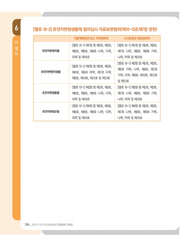 6 별 표 3 264 _ 환경부 유전자변형생물체 안전관리 가이드 [별표 10-2] 유전자변형생물체 협의심사 자료보완범위 제10-13조제7항 관련 작물재배환경 또는 자연생태계 수산환경과 해양생태계 유전자변형작물 [별표 10-1] 제1항 중 제2호, 제3호, 제6호, 제8호, 제9호 나목, 다목, 라목 및 제10호 [별표 10-1] 제1항 중 제2호, 제3호, 제7호 나목, 제8호, 제9호 가목, 나목, 마목 및 제10호 유전자변형미생물 [별표 10-1] 제2항 중 제2호, 제3호, 제4호, 제6호 라목, 제7호 다목, 제9호, 제10호, 제12호 및 제13호 [별표 10-1] 제2항 중 제2호, 제3호, 제5호 가목, 나목, 제6호, 제7호 가목, 다목, 제9호, 제10호, 제12호 및 제13호 유전자변형동물...