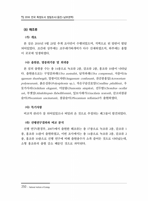2016 전국 특정도서 정밀조사 옹진-남부권역 250 ? National Institute of Ecology 8 해조류 가 개요 본 섬은 2016년 9월 23일 추계 조사만이 수행되었으며, 직벽으로 된 암반이 발달 되어있었다. 조간대 상부에는 조무래기따개비가 다수 산재하였으며, 하부에는 홍합 이 곳곳에 밀생하였다. 나 출현종, 멸종위기종 및 희귀종 본 섬의 출현종 수는 총 14종으로 녹조류 2종, 갈조류 2종, 홍조류 10종이 나타났 다. 출현종으로는 구멍갈파래 Ulva australis , 납작파래 Ulva compressa , 지충이 Sa rgassum thunbergii , 알쏭이모자반 Sargassum confusum , 잔금분홍잎 Acrosorium polyneurum , 붉은실류 Polysiph...