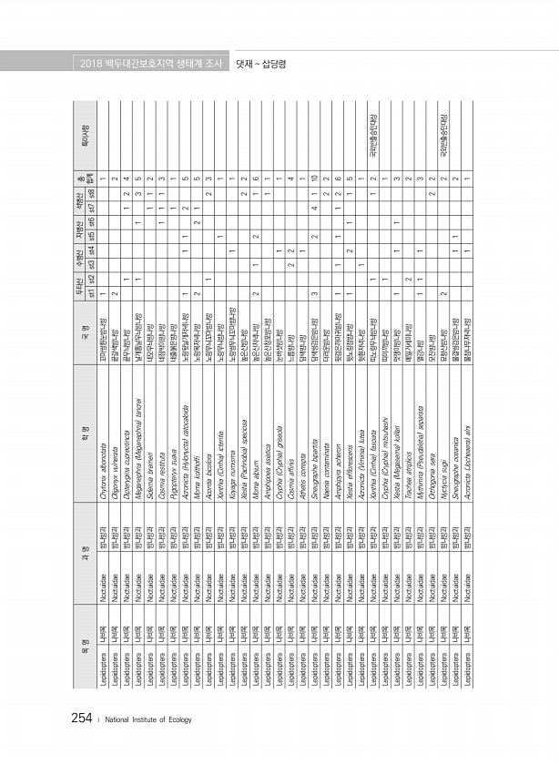 254 ? National Institute of Ecology 목 명 과 명 학 명 국 명 두타산 수병산 자병산 석병산 총 st1 st2 st3 st4 st5 st6 st7 st8 합계 특이사항 Lepidoptera 나비목 Noctuidae 밤나방과 Chytonix albonotata 꼬마쌍흰눈밤나방 1 1 Lepidoptera 나비목 Noctuidae 밤나방과 Oligonyx vulnerata 끝갈색밤나방 2 2 Lepidoptera 나비목 Noctuidae 밤나방과 Dipterygina cupreotincta 끝무늬밤나방 1 1 2 4 Lepidoptera 나비목 Noctuidae 밤나방과 Meganephria Meganephria tancrei 날개톱날무늬밤나방 1 1 3 5 Lepidoptera 나...