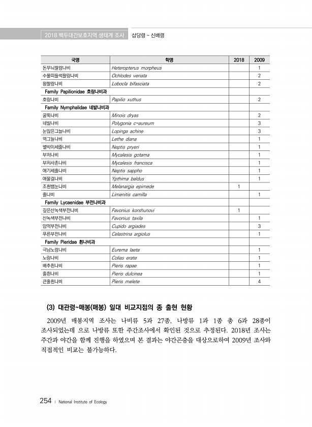 2018 백두대간보호지역 생태계 조사 삽당령 신배령 254 ? National Institute of Ecology 국명 학명 2018 2009 돈무늬팔랑나비 Heteropterus morpheus 1 수풀떠들썩팔랑나비 Ochlodes venata 2 왕팔랑나비 Lobocla bifasciata 2 Family Papilionidae 호랑나비과 호랑나비 Papilio xuthus 2 Family Nymphalidae 네발나비과 굴뚝나비 Minois dryas 2 네발나비 Polygonia c-aureum 3 눈많은그늘나비 Lopinga achine 3 먹그늘나비 Lethe diana 1 별박이세줄나비 Neptis pryeri 1 부처나비 Mycalesis gotama 1 부처사촌나비 Mycalesis fra...