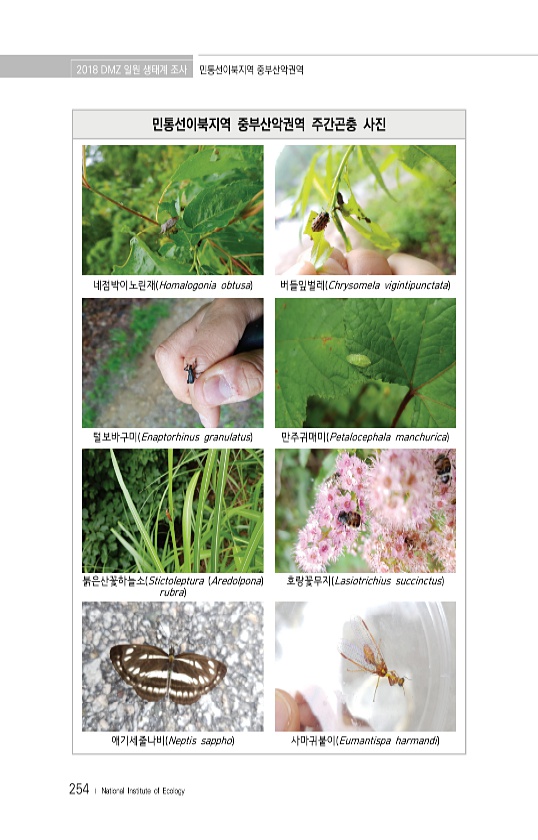 2018 DMZ 일원 생태계 조사 민통선이북지역 중부산악권역 254 ? National Institute of Ecology 민통선이북지역 중부산악권역 주간곤충 사진 네점박이노린재 Homalogonia obtusa 버들잎벌레 Chrysomela vigintipunctata 털보바구미 Enaptorhinus granulatus 만주귀매미 Petalocephala manchurica 붉은산꽃하늘소 Stictoleptura Aredolpona rubra 호랑꽃무지 Lasiotrichius succinctus 애기세줄나비 Neptis sappho 사마귀붙이 Eumantispa harmandi