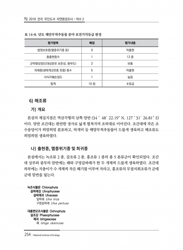 2018 전국 무인도서 자연환경조사 여수 2 254 ? National Institute of Ecology 평가항목 배점 평가내용 법정보호종 멸종위기종 등 0 미출현 총출현종수 1 12 종 군락형성정도 대상분포 보존성, 풍부도 3 보통 외래종 생태계교란종 포함 종수 5 미출현 서식지훼손정도 1 높음 합계 10 점 Ⅲ등급 표 14-8. 단도 해안무척추동물 분야 보전가치등급 판정 6 본섬의 채집지점은 역삼각형의 남쪽 암반 34˚ 48′ 22.19″ N, 127˚31′ 26.81″ E 이다. 암반 조간대는 완만한 경사로 넓게 펼쳐지며 조하대로 이어진다. 조간대에 작은 조 수웅덩이가 띄엄띄엄 분포하고, 따개비 등 해양무척추동물이 드물게 생육하고 해조류도 띄엄띄엄 생육하였다. , 본섬에서는 녹조류 2 종, 갈조류 ...