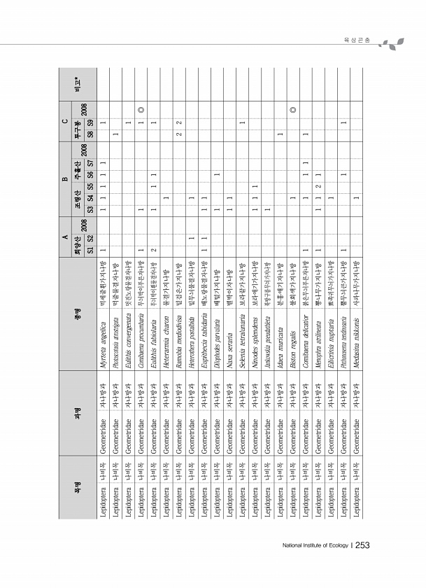 육 상 곤 충 National Institute of EcologyⅠ253 목명 과명 종명 A B C 희양산 비고* 2008 조령산 주흘산 2008 투구봉 2008 S1 S2 S3 S4 S5 S6 S7 S8 S9 Lepidoptera 나비목 Geometridae 자나방과 Myrteta angelica 먹세줄흰가지나방 1 1 1 1 1 1 1 Lepidoptera 나비목 Geometridae 자나방과 Photoscotosia atrostrigata 먹줄물결자나방 1 Lepidoptera 나비목 Geometridae 자나방과 Eulithis convergenata 멋진노랑물결자나방 1 Lepidoptera 나비목 Geometridae 자나방과 Comibaena procumbaria 무늬박이푸른자나방 1 1 1 ...