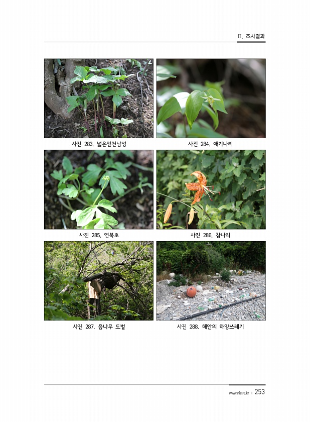 Ⅱ. 조사결과 www.nie.re.kr ? 253 사진 283. 넓은잎천남성 사진 284. 애기나리 사진 285. 연복초 사진 286. 참나리 사진 287. 음나무 도벌 사진 288. 해안의해양쓰레기