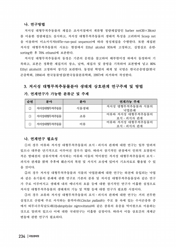 나 연구방법 저서성 대형무척추동물의 채집은 조사지점에서 계류형 정량채집망인 Surber net 30×30cm 를 이용한 정량채집도 실시하고, 저서성 대형무척추동물의 생태적 특성을 고려하여 Scoop net 을 이용하여 미소서식처 riffle-run-pool sequence 에 따라 정성채집을 수행한다. 또한 채집된 저서성 대형무척추동물의 시료는 현장에서 Ethyl alcohol 95%에 고정하고, 실험실로 운반? sorting한 후 70% ethanol에 보존한다. 저서성 대형무척추동물의 동정은 기존의 문헌을 참고하여 해부현미경 하에서 동정하여 기 록하고, 표본은 정확한 채집지의 장소, 날짜, 채집자 및 종명을 기록하여 표본병에 넣고 80% Ethyl alcohol로 고정하여 장기간 보관한다. 동정된 학명의...