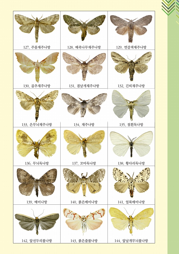 127. 주름재주나방 128. 때죽나무재주나방 129. 연갈색재주나방 130. 곱추재주나방 131. 겹날개재주나방 132. 긴띠재주나방 133. 은무늬재주나방 134. 재주나방 135. 점흰독나방 136. 무늬독나방 137. 꼬마독나방 138. 황다리독나방 139. 매미나방 140. 붉은매미나방 141. 얼룩매미나방 142. 앞선두리불나방 143. 붉은줄불나방 144.앞날개무늬불나방